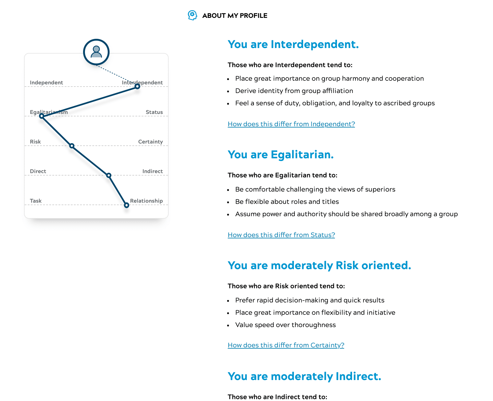Możecie również skorzystać z narzędzi, takich jak GlobeSmart firmy Aperian, wersja bezpłatna testu pozwoli Wam lepiej poznać wasze preferencje kulturowe w następujących obszarach: wasze podejście do ryzyka, waszą niezależność, wasze podejście i nastawienie do hierarchii (bardziej lub mniej zależny), styl komunikacji czy też nastawienie na zadania. To co to narzędzie również daje to możliwość porównania Waszego wyniku do przeciętnej osoby w innej kulturze, na przykład Twój profil względem uśrednionego Amerykanina.